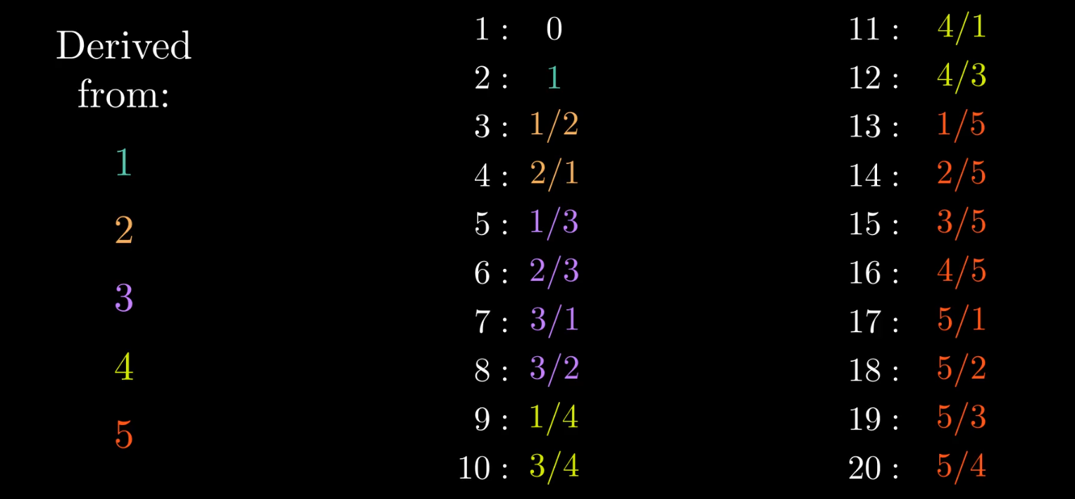 For example, and for simplicity, consider the rational numbers only. To enumerate them, start with 0, then list the numbers based on 1, which are +1 and −1, then the numbers that involve also 2, which are +2, −2, +1/2 and −1/2, and so on with the numbers involving also 3, 4 etc. Some numbers may pop up repeatedly (for example, in step 2, two halves makes 1, which was already enumerated in step 1), but we enumerate each number only the first time we encounter it.