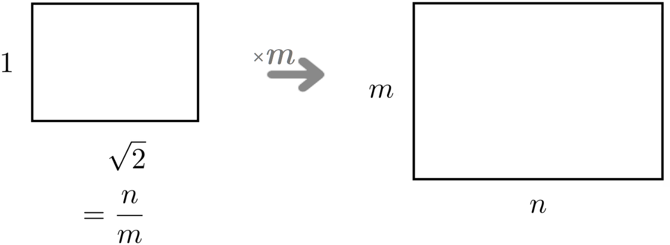 For fun, let us consider another infinite descent proof, with a geometric illustration. Consider a rectangle of sides √2 and 1, respectively, and suppose that √2 is equal to the ratio of integers n/m. Since √2 > 1, it obviously holds that n > m; also, since √2 < 2, it holds that n < 2m. Let us scale the rectangle by a factor of m, so that the lengths of its sides become n and m, respectively, both integers.