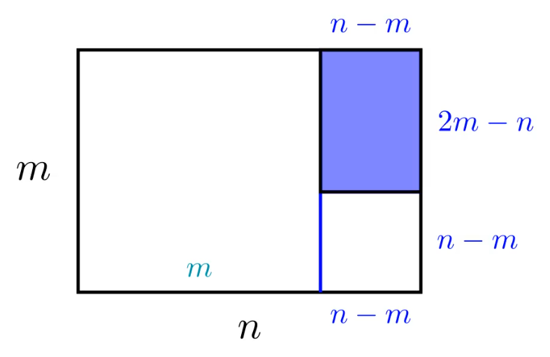 Now mark the point m on the side n, and use it to form a square of side m inside our rectangle. This leaves another rectangle of size (n – m) × m on the right. Next, form another square, of side (n – m), on the bottom of that rectangle. This leaves at the top right corner a rectangle, highlighted in blue, whose sides have lengths n – m and 2m – n, respectively. Since n and m are integers, these lengths, n – m and 2m – n, are also positive integers.