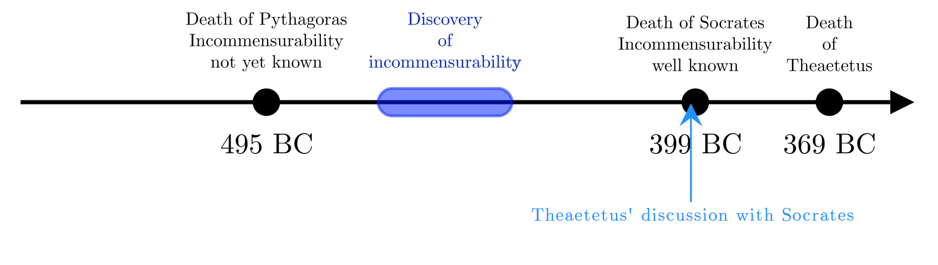 According to ancient tradition preserved by the philosopher of late antiquity Iamblichus (245 – 325 AD), it was Hippasus who discovered incommensurability. Of course, having lived so many centuries later, Iamblichus' testimony is of limited credibility, and in fact the tradition that he preserves does seem to contain legendary elements, such as that Hippasus died by drowning as a divine punishment for making public the secret Pythagorean knowledge. But part of his information seems to originate in the history of Mathematics written by Eudemus of Rhodes, a pupil of Aristotle, who is trustworthy and lived much closer to the time of Hippasus. Unfortunately, though, we are not aware of any contemporary source that directly credits Hippasus with this discovery. Hippasus belonged to the generation preceding that of Theodorus of Cyrene, who was the mathematician demonstrating to Theaetetus and his fellow students the irrationality of the square roots of 3, 5 etc. Therefore, him being the discoverer of incommensurability would fit well with Plato's story. This would mean that incommensurability was discovered in the middle of the 5th century BC.