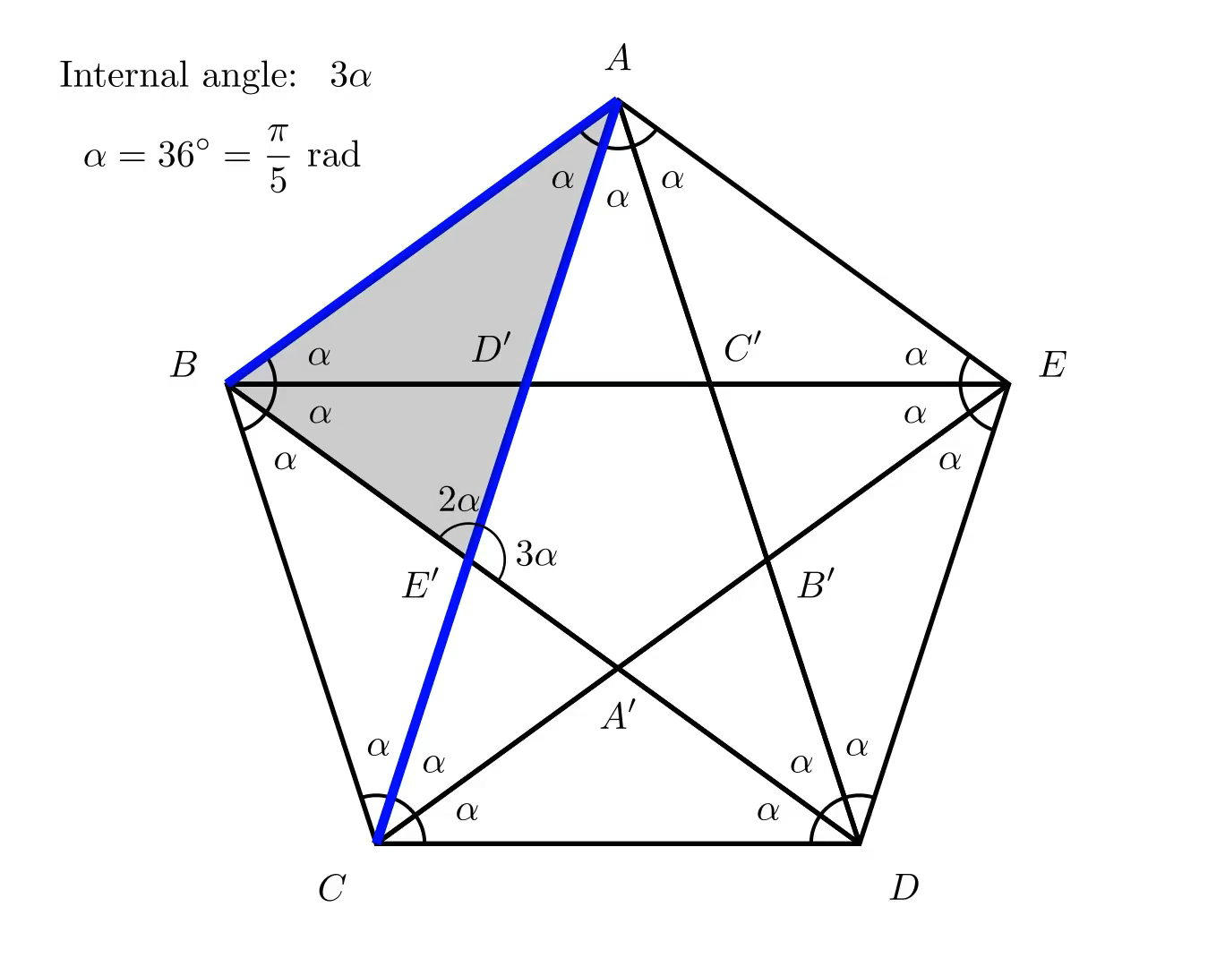 To determine the angle β, let us consider the internal angle A, at the top of our pentagon. Since it equals 108°, and it also equals 2×β+α, where α=36°, it turns out that β also equals 36°. The two angles happen to be equal. So, to simplify things, let us get rid of β and label all angles as α. In radians, α is equal to a fifth of the straight angle π. Each internal angle of the pentagon equals 3α = 3π/5.