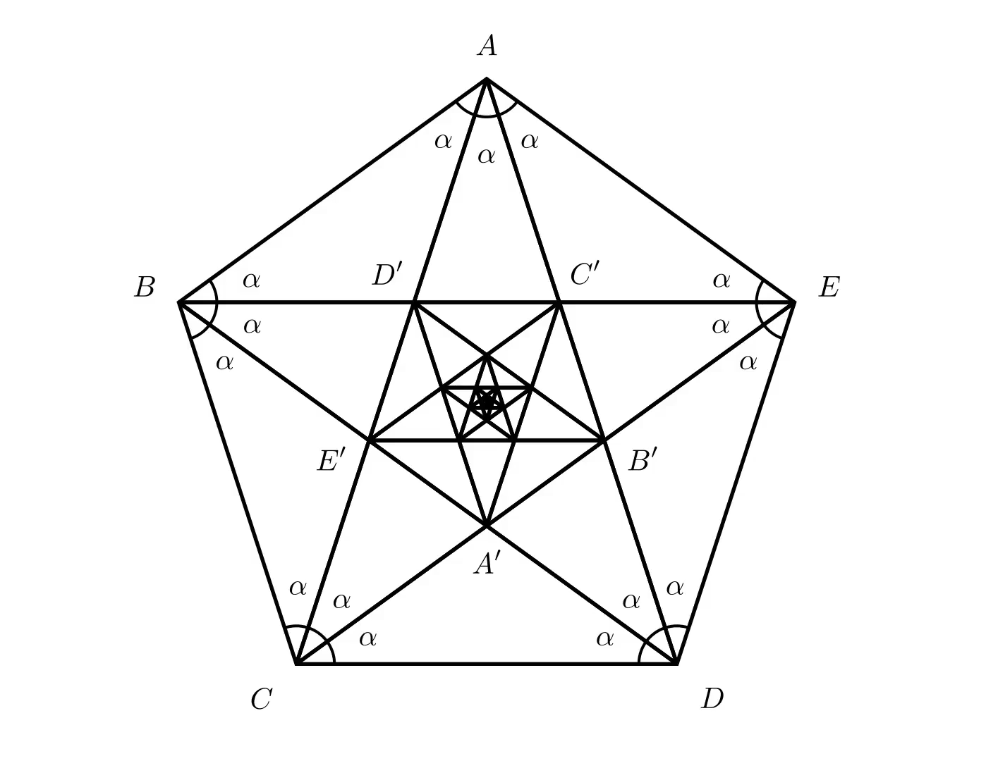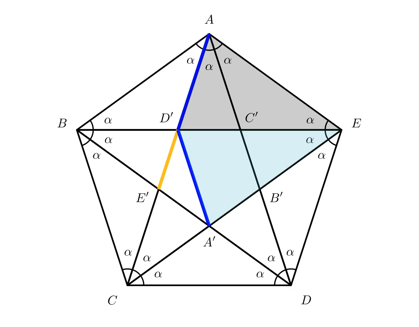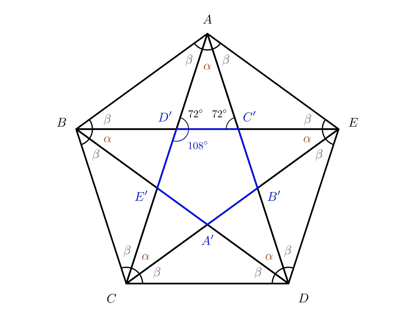 Now let us draw all the diagonals of the pentagon, with two emanating from each vertex. This splits each internal angle into one angle denoted a, between the diagonals, and two angles denoted β, on either side.The diagonals form a pentagram, and in the middle of the figure we can see, highlighted, another pentagon. We know that it is a regular pentagon because, due to symmetry, all its angles and all its sides are equal. Therefore, we know that its internal angles equal 108 degrees each. From this we can deduce that the base angles of the isosceles triangle AD'C' equal 72 degrees and hence the remaining angle a equals 36 degrees (a = 180°–72°–72° = 36°).