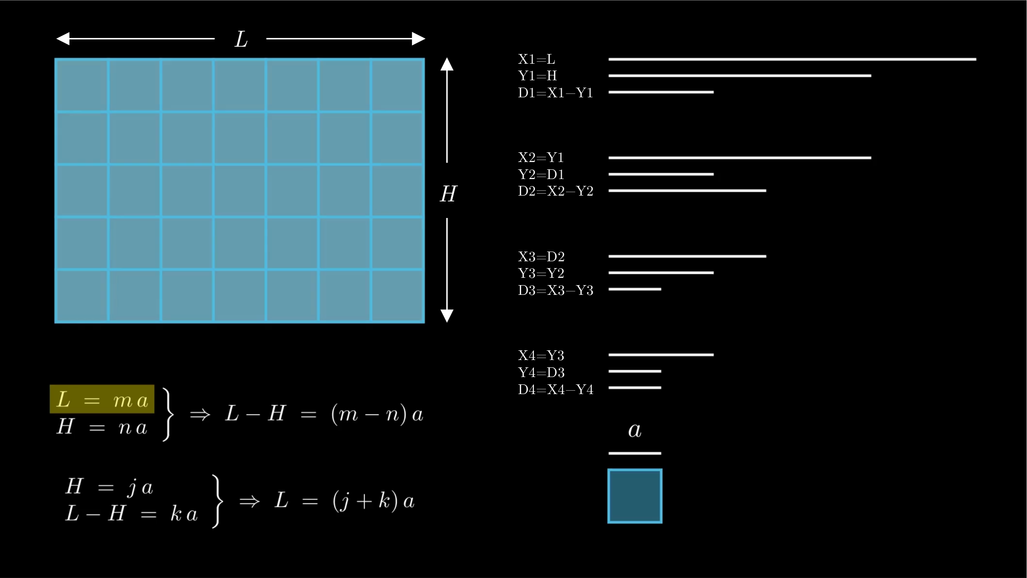 $$ \begin{equation} \left. \begin{array}{l} H \;=\; j \, a \\ L-H \;=\; k \, a \end{array} \right\} \;\Rightarrow\; L \;=\; (j+k) \, a \end{equation} $$Thus the problem is reduced to finding the common measure of a pair of lengths that are smaller than the original pair.