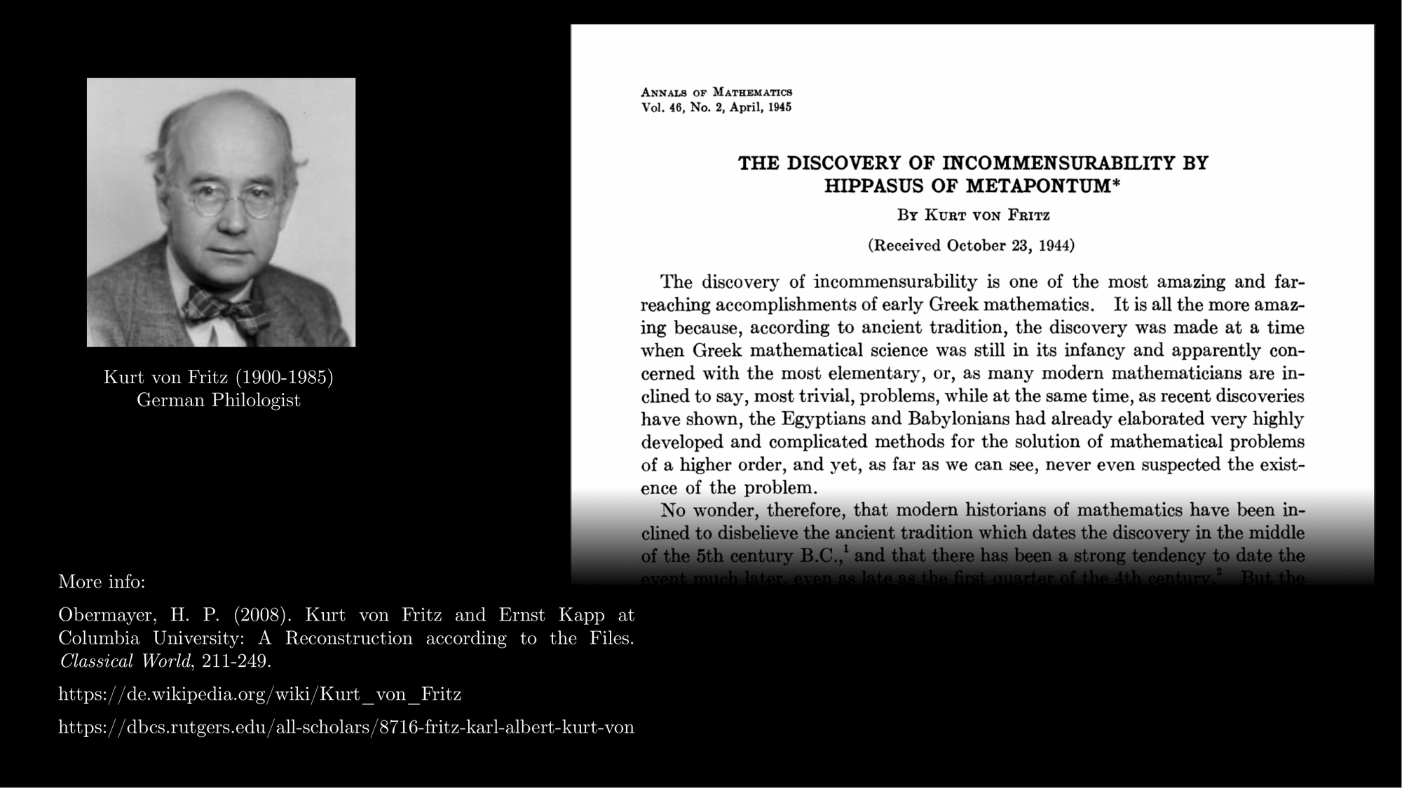Kurt von Fritz was a remarkable person, and since the present video has a historical perspective, it is only fair that we begin with mentioning briefly some biographical details about him. He was born on the 25th of August 1900, and died on the 16th of July 1985. He was a German professor of Classical Philology. He came from a military family and although he also had an interest for philosophy, mathematics and science, he was eventually won over by classics, when he heard a lecture by Edward Schwartz in 1919 on the Greek historian Thucydides, who described the fall from civilisation to barbarism during the Peloponnesian war. It seems that Kurt von Fritz valued human persons and their relationships more than the marvels of the inanimate universe, and in classics he found the childhood of modern culture, which was crucial for its shaping. But, being adept in mathematics, he was very suitable to undertake the task of presenting the history of the discovery of the irrationals, doing some detective work in the process in order to clarify some details that were disputed.