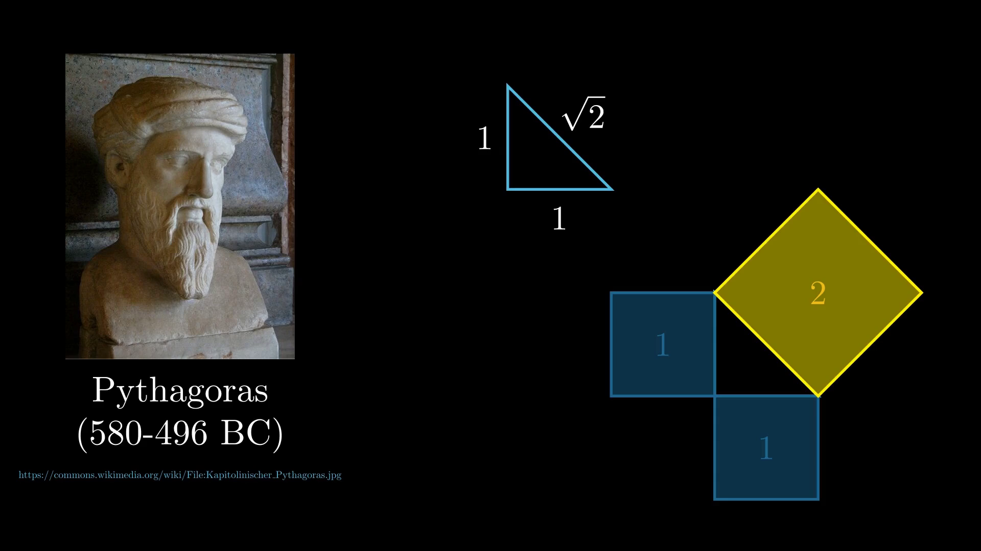 The second character that we need to succinctly introduce is the far more ancient figure, Pythagoras. The revelation of irrational numbers is credited to the philosophers of the Pythagorean school. Moreover, the number most renowned for being irrational is √2, which arises organically in relation to the Pythagorean theorem. These facts may give the impression that Pythagoras was a great mathematician. However, this does not appear to have been the case; yet his successors did develop mastery of mathematics, motivated by their school founder's attribution of mystical significance to numbers.