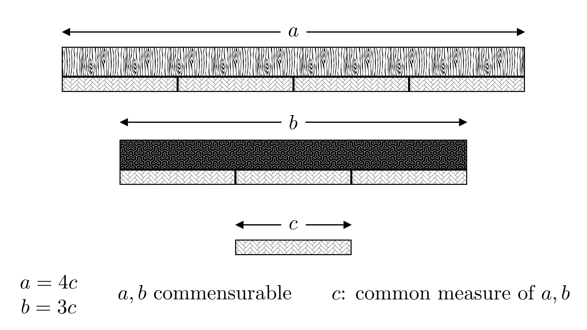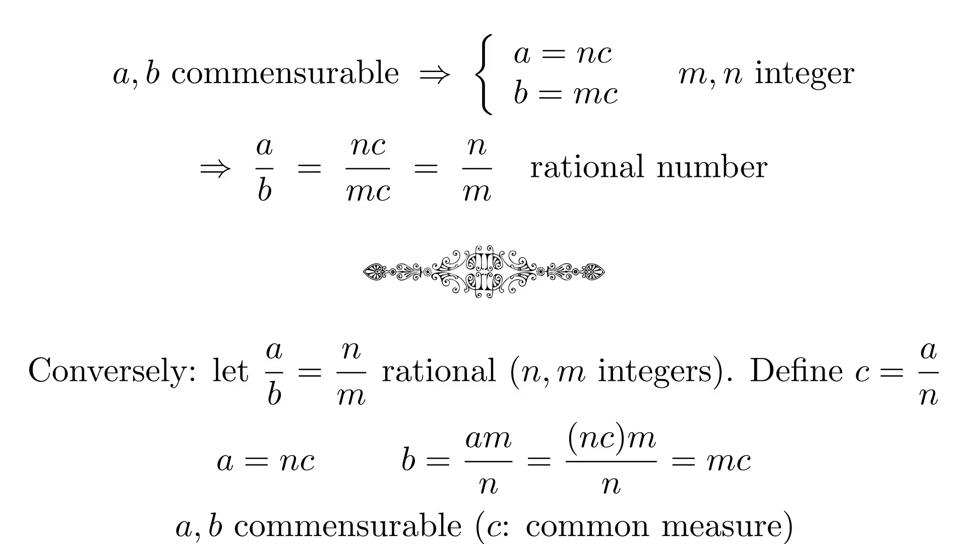 To see this, consider two quantities (say, lengths) a and b, which have a common measure c (and are thus commensurable). This means that c fits perfectly into a an integer number of times, as it does also into b. In more mathematical language, there exist integers n and m such that a equals n times c and b equals m times c. This means that the ratio of the two quantities, a / b, equals n / m, which is a rational number.