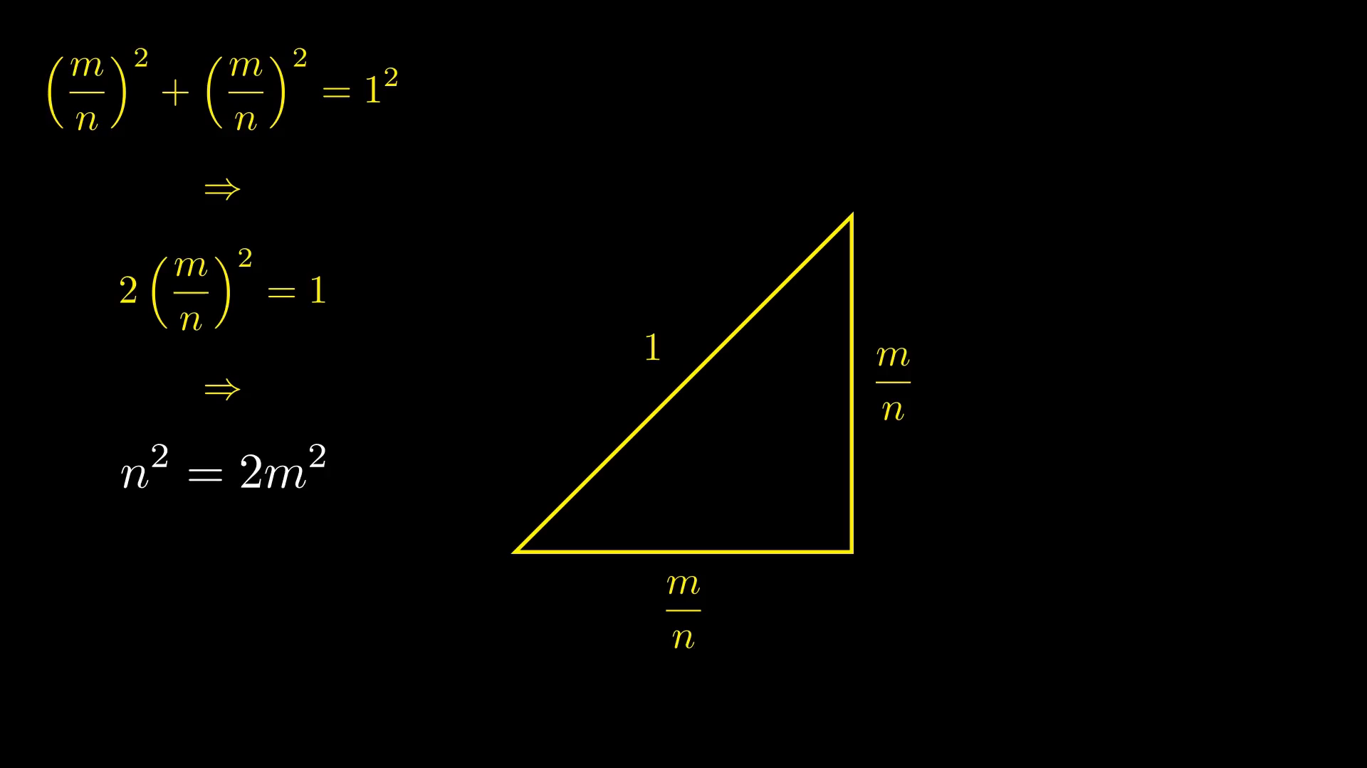 If we assume that the leg-to-hypotenuse ratio is equal to m/n, where m and n are integers, and assuming that the Pythagorean theorem holds for this triangle as well (a fact that the Pythagoreans may not have known for sure but likely suspected), then we arrive at a required relationship between these two integers: