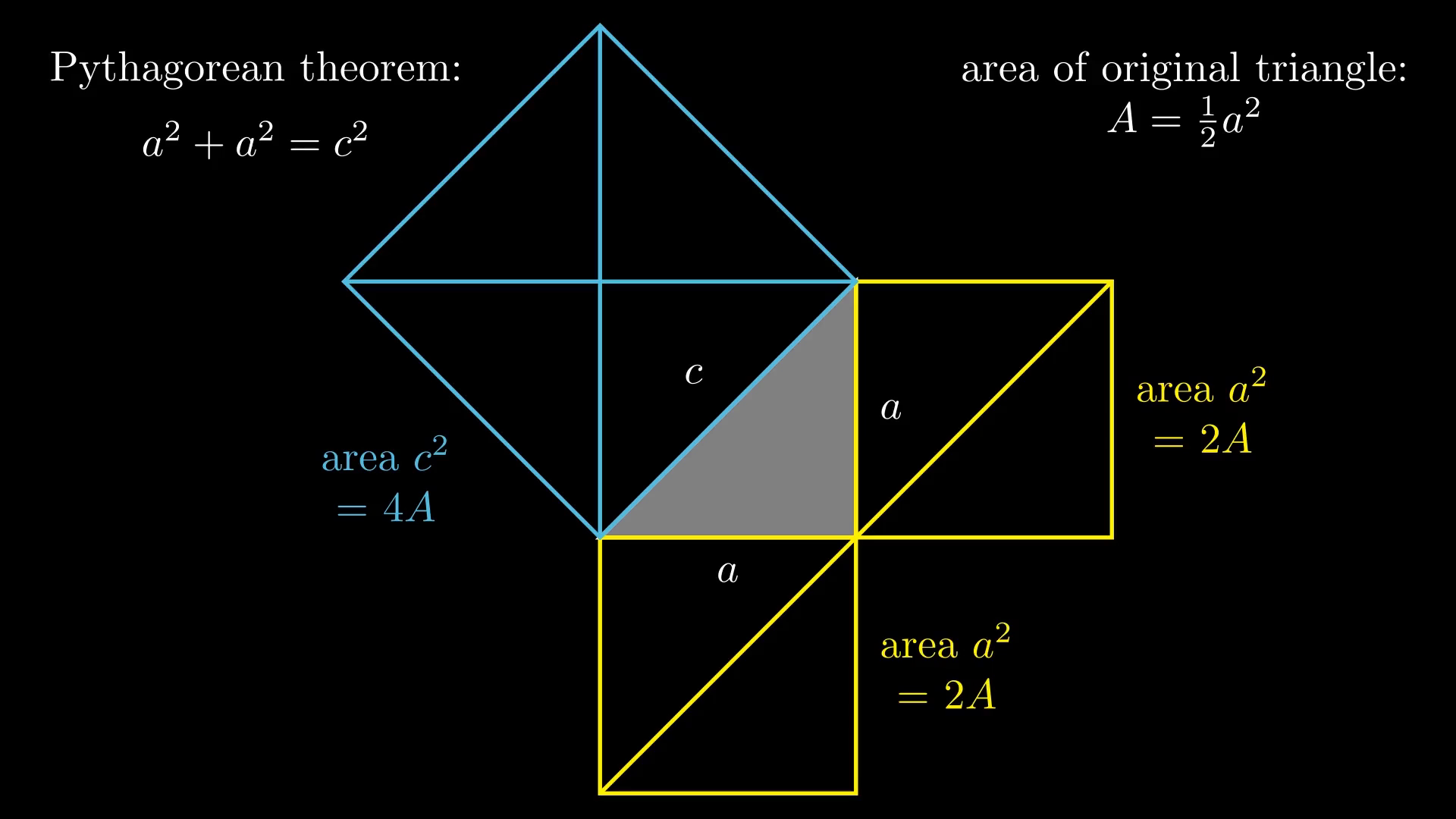 But, as von Fritz noted, this objection is weak because only a limited version of the Pythagorean theorem was needed, applicable to the special case of an isosceles triangle, the truth of which is almost immediately obvious by inspection when one draws such a triangle and the squares of its sides. In the figure below the shaded triangle is an isosceles right triangle with legs a and hypotenuse c, and we can see that the squares of the legs can each be divided into two triangles congruent to the original triangle, while the square of the hypotenuse can be split into 4 such triangles. We know that all of these triangles are congruent because they are all isosceli and right, and for each pair of them we can match the lengths of their legs or their hypotenuses. Therefore, the Pythagorean theorem for this special case obviously holds: the sum of the squares of the legs (2+2 = 4 triangles) is equal to the square of the hypotenuse (4 triangles). This is not a sophisticated result and the early Pythagoreans would have had no trouble figuring it out.