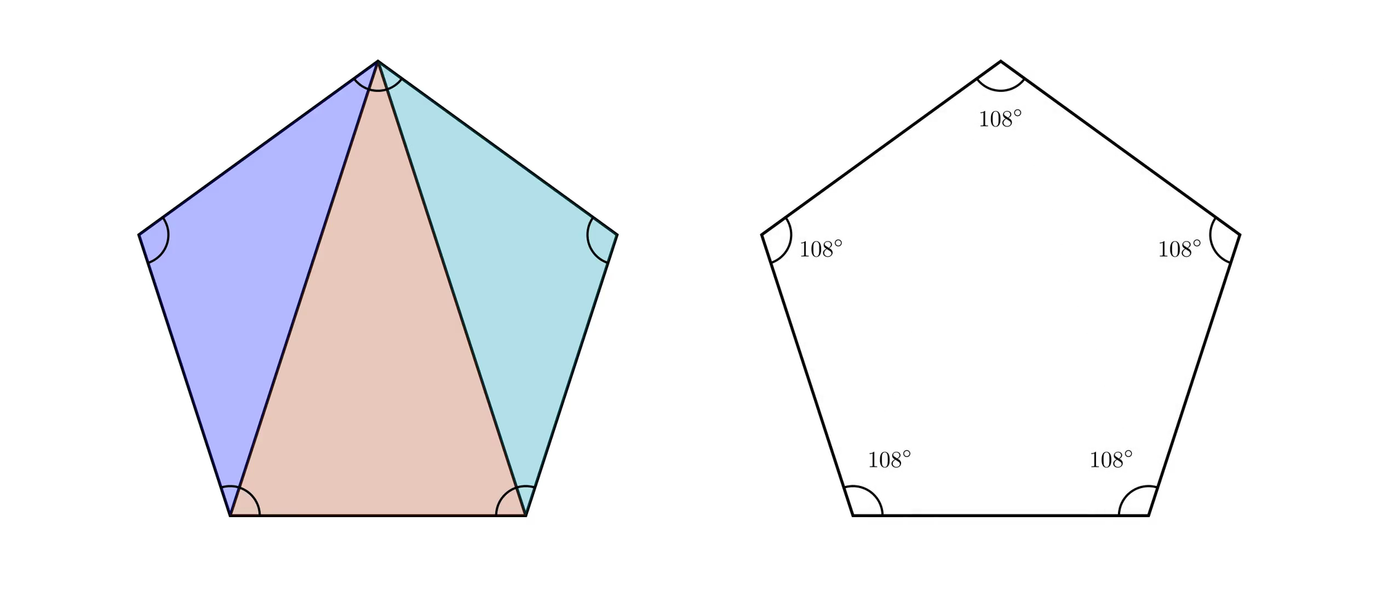 First, let us draw two diagonals from the same vertex, to divide the pentagon into three triangles. The angles of each triangle sum to 180 degrees, hence the angles of all the triangles summed together, which equal the sum of all interior angles of the pentagon, is equal to 3*180 = 540 degrees. Hence, each of the 5 internal angles of the pentagon equals 540 divided by 5, or 108 degrees.