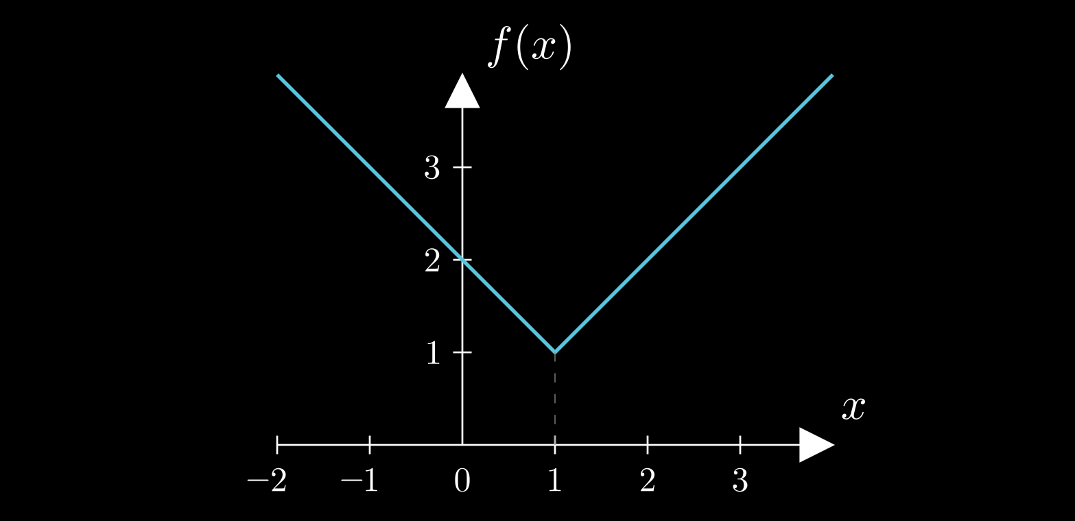 $$ \begin{equation} \label{x3 FD} \frac{f(x\!+\!\delta x)-f(x)}{\delta x} \;=\; \frac{(x\!+\!\delta x)^3 - x^3}{\delta x} \;=\; 3x^2 \;+\; 3 x\, \delta x \;+\; (\delta x)^2 \end{equation} $$ $$ \begin{equation} \label{x3 CD} \frac{f(x\!+\!\delta x)-f(x\!-\!\delta x)}{2\delta x} \;=\; \frac{(x\!+\!\delta x)^3 - (x\!-\!\delta x)^3}{2\delta x} \;=\; 3x^2 \;+\; (\delta x)^2 \end{equation} $$Now it is in both cases that we need to shrink δx towards zero in order to obtain the instantaneous rate of change. But we notice again that, as for most functions that are of interest, how we construct the interval around x does not matter; in all cases, as we shrink that interval towards x itself we get the same limiting instantaneous rate of change. In the present case, we see that both formulae, ($\ref{x3 FD}$) and ($\ref{x3 CD}$), converge to the same value, 3x2, as δx → 0, which we denote as df/dx. Not all functions are so well-behaved, though. Sometimes the limiting rate of change at x as the interval shrinks does depend on the type of interval chosen, such as, for example, when the function has a sharp corner at x (see the figure below); sometimes there isn't even a definite limiting value. In such cases we say that the function is not differentiable at x.