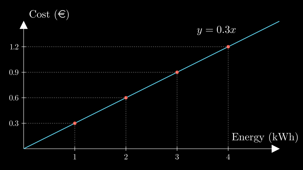 $$ \text{rate} \quad r \;=\; \frac{0.3\text{ €}}{1 \text{ kWh}} \;=\; \frac{0.6\text{ €}}{2 \text{ kWh}} \;=\; \frac{0.9\text{ €}}{3 \text{ kWh}} \;=\; 0.3\text{ € / kWh} $$If we know this rate of change, then we can calculate the total accumulated cost by multiplying the rate by the total consumed energy: