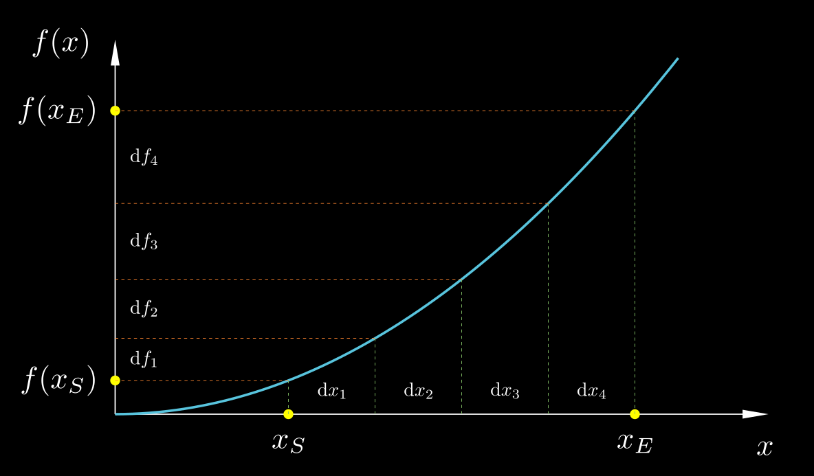 $$ \begin{equation} \label{FTC precursor} \Delta f \;=\; f(x_E) - f(x_S) \;=\; \sum_{x=x_S}^{x=x_E} \mathrm{d}f_i \;=\; \sum_{x=x_S}^{x=x_E} r(x_i) \, \mathrm{d}x_i \end{equation} $$