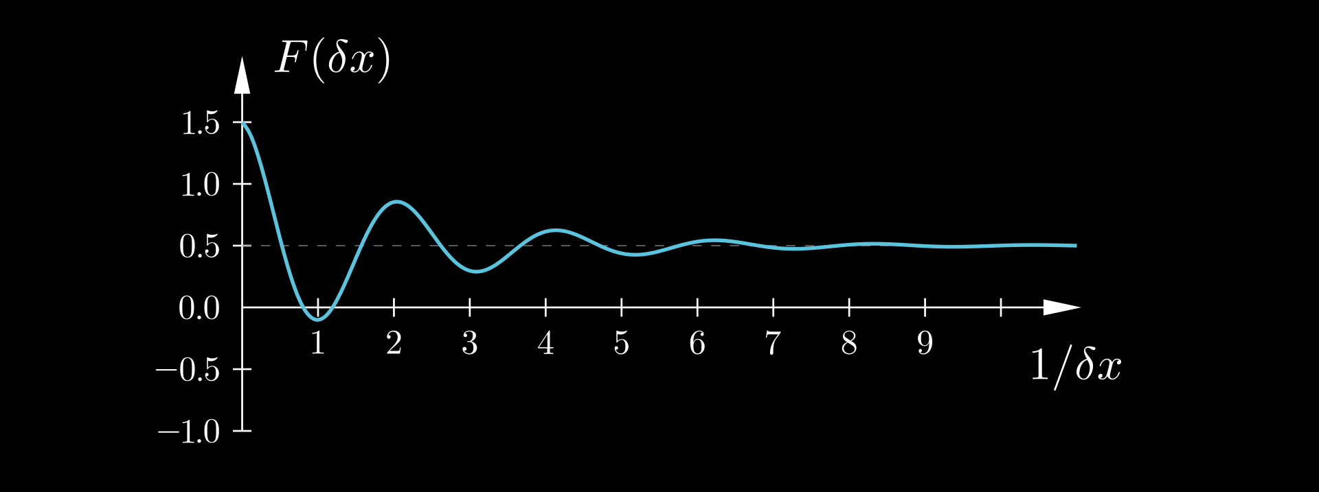 How about, "the limit is the value that the finite differences can get arbitrarily close to, but never reach". This would work in our particular example, as the only value for which this holds is 0.5. But in general, it doesn't always work. To illustrate the problem, suppose that CD's were not strictly increasing as δx is reduced, but converged to 0.5 with damped oscillations. In that case, the precise value 0.5 would be reached every now and then, in fact infinitely many times. Our definition would therefore erroneously reject the value 0.5 as the limit.