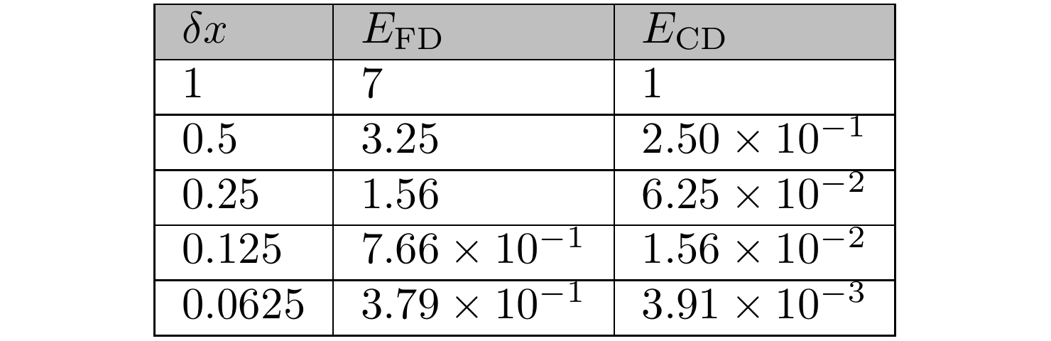 The left-hand sides of equations ($\ref{x3 FD}$) and ($\ref{x3 CD}$) can be viewed as approximations to the derivative df/dx. For obvious reasons, the expression ($\ref{x3 FD}$) is called a "forward difference" and the expression ($\ref{x3 CD}$) is called a "central difference". While both converge to the same limit value (the derivative), they do not do so at the same pace. By inspecting the right-hand sides of ($\ref{x3 FD}$) and ($\ref{x3 CD}$), we see that their respective errors are EFD = 3x δx + (δx)2 and ECD = (δx)2. The table below lists those errors at x = 2, for smaller and smaller values of δx. Each successive value of δx is half of the previous one. We observe that the central difference error diminishes more rapidly than the forward difference one – for the smallest δx listed, ECD is nearly 100 times smaller than EFD.