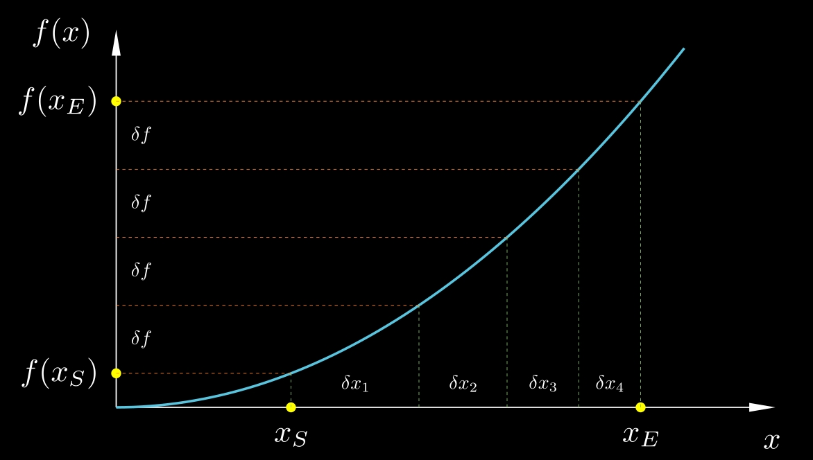 But suppose that the change in the independent variable, Δx = xE − xS, is not small. If we know the variable rate of change, r(x), of f(x) with respect to x, how can we use this knowledge to calculate the corresponding change Δf = f(xE) − f(xS)? For example, if I have recorded the readings of my car's speedometer throughout my trip, how can I use this information to calculate the total distance travelled? What we can do is illustrated in the figure below. We can split the large change Δx into very small incremental changes dx each of which is small enough such that f varies linearly across it, calculate the corresponding changes df from eq. ($\ref{df=rdx}$), and sum all of them, to obtain: