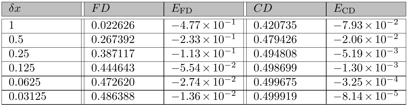 To check whether FD and CD converge to df/dx as δx → 0 we therefore need to check that |δf/δx − df/dx|, i.e. the errors EFD and ECD listed in the respective columns of table 2, tend to zero as δx becomes smaller and smaller. Indeed, this is the case. If the behaviour of FD is such that its error is proportional to δx, and the behaviour of CD is such that its error is proportional to (δx)2, which is what the numerical results suggest, then the above definition is satisfied and indeed the value 0.5 is the limit of both FD and CD.