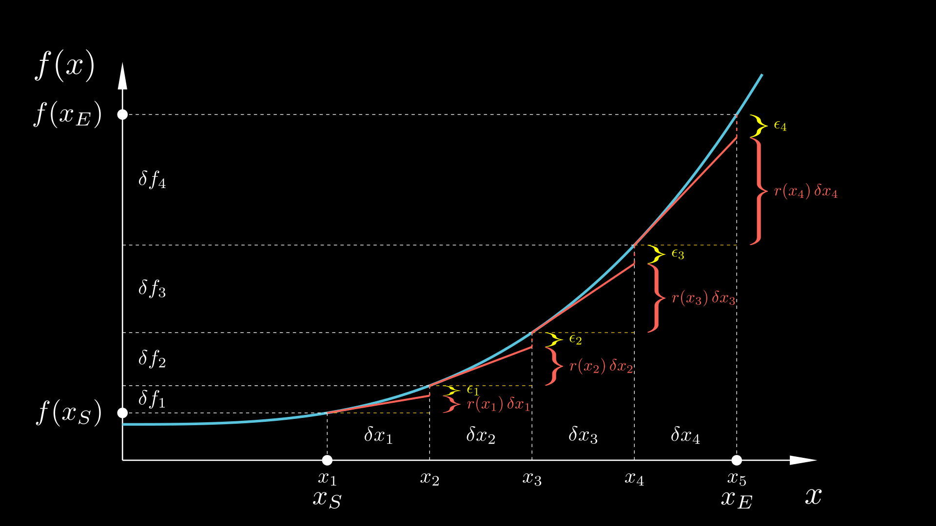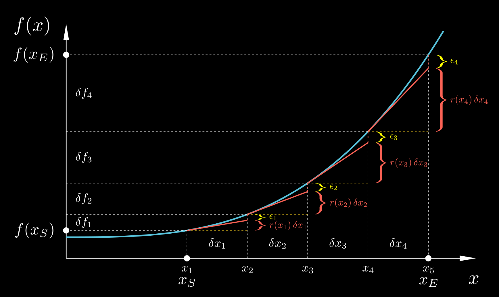 $$ \begin{equation} \label{Riemann sum} \sum_{i=1}^{N} \left. \frac{\mathrm{d}f}{\mathrm{d}x} \right|_{x_i^*} \! \delta x_i \;=\; \left( f(x_E) - f(x_S) \right) \;-\; E \end{equation} $$where the error $E = \bar{e} (f(x_E) - f(x_S))$ will be proportional to δxi if $x_i^* = x_i$ and proportional to (δxi)2 if $x_i^* = x_i + \delta x_i/2$.