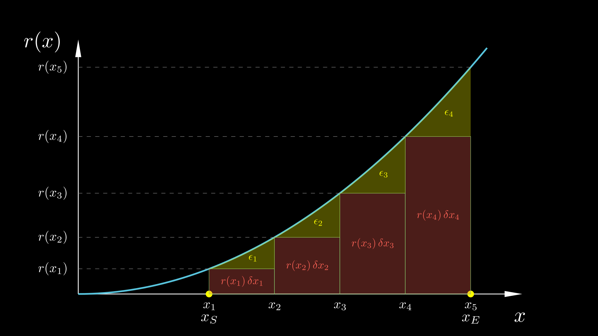 $$ \begin{equation} \label{ei} \epsilon_i \;=\; \int_{x_i}^{x_{i+1}} r(x) \, \mathrm{d}x \;-\; r(x_i) \, \delta x_i \end{equation} $$Thus, indeed, ϵi is the difference between the area below r(x) from x = xi to x = xi+1 and the area of the rectangle i; it is the area painted yellow in the above figure.