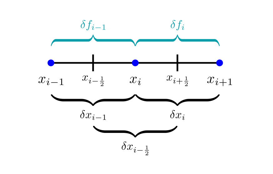 $$ \left. \frac{\mathrm{d}^2f}{\mathrm{d}x^2} \right|_{x_i} \;\approx\; \frac{ \left. \dfrac{\mathrm{d}f}{\mathrm{d}x} \right|_{x_{i-\frac{1}{2}}} - \left. \dfrac{\mathrm{d}f}{\mathrm{d}x} \right|_{x_{i+\frac{1}{2}}} }{\delta x_{i-\frac{1}{2}}} \;\approx\; \frac{ \dfrac{\delta f_{i}}{\delta x_{i}} - \dfrac{\delta f_{i-1}}{\delta x_{i-1}} }{\delta x_{i-\frac{1}{2}}} $$Note that there are two levels of approximation in the above expression: both the first and second derivatives are approximated via central differences.