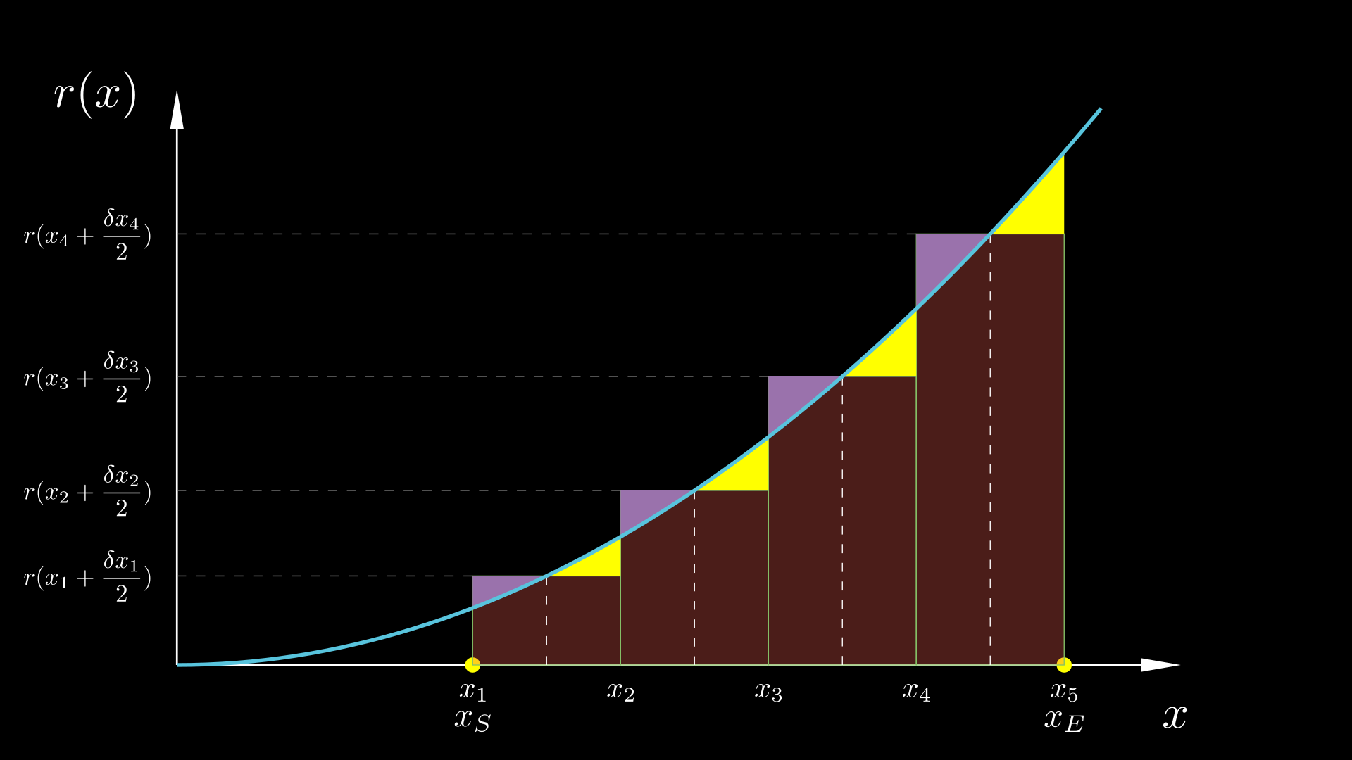 The previous analysis concerned the case $x_i^* = x_i$. How about other cases? Well, most other cases are similar to the $x_i^* = x_i$ case; but the case $x_i^* = x_i + \delta x/2$ is somewhat special. The r(x) versus x diagram along with a middle Riemann sum is shown below, with the height of each rectangle i being equal to the value of r(x) at the midpoint of the interval, r(xi + δxi/2). What is the error ϵi now? We can see that it consists of two parts, painted in yellow and purple, respectively. The yellow part is how much the rectangle falls short of the area below the r(x) curve; but the purple part is how much the rectangle extends beyond the curve. Thus, the total error ϵi equals the yellow area minus the purple area.