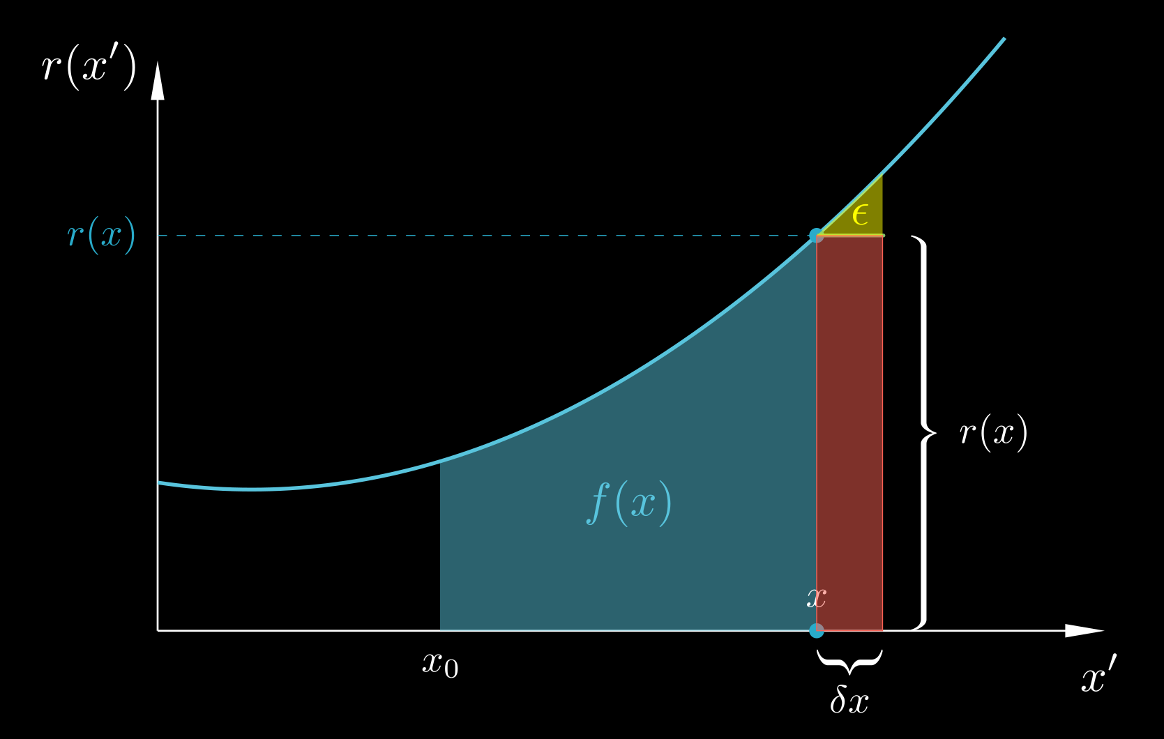$$ \begin{equation} \label{derivative of integral} \frac{\mathrm{d}}{\mathrm{d}x} \int_{x_0}^x r(x') \, \mathrm{d} x' \;=\; r(x) \end{equation} $$This result tells us that the rate of change of f(x) is equal to r(x), which actually makes sense: the larger the value of r(x), the faster the area f(x) will grow as we move x towards the right. In the limit δx → 0, the yellow error area ϵ becomes negligible compared to the red rectangle r(x)δx (proof: from eq. (44), ϵ/(r(x)δx) = (δx/2)(dr/dx)/r(x) → 0 as δx → 0), and therefore the whole change δf can be assumed to equal r(x)δx; hence the rate of increase of the area f(x) is δf/δx = (r(x)δx)/δx = r(x). Equation ($\ref{derivative of integral}$) is another expression of the fundamental theorem of calculus, showing that differentiation and integration are opposite operations, but instead of showing the effect of integrating the derivative as eq. ($\ref{FTC again2}$), it shows the effect of differentiating the integral.