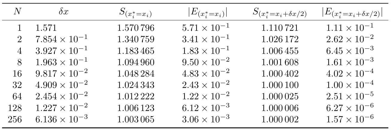 $$ \begin{equation} \label{ei MRS} \epsilon_i \;\sim\; \left. \frac{\mathrm{d}^2 r}{\mathrm{d}x^2} \right|_{x_i} \! (\delta x_i)^3 \;=\; \left. \frac{\mathrm{d}^3 f}{\mathrm{d}x^3} \right|_{x_i} \! (\delta x_i)^3 \end{equation} $$(as the second derivative of r(x) is the third derivative of f(x)). The total error Ε = Σϵi, just like in the $x_i^* = x_i$ case, will decrease more slowly, and in particular it will be proportional to (δx)3×(δx)−1 = (δx)2, because the total number N = (xE−xS)/δx of individual errors is proportional to (δx)−1 (the smaller δx, the more rectangles and errors we have). This is in perfect agreement with our previous numerical experiments.